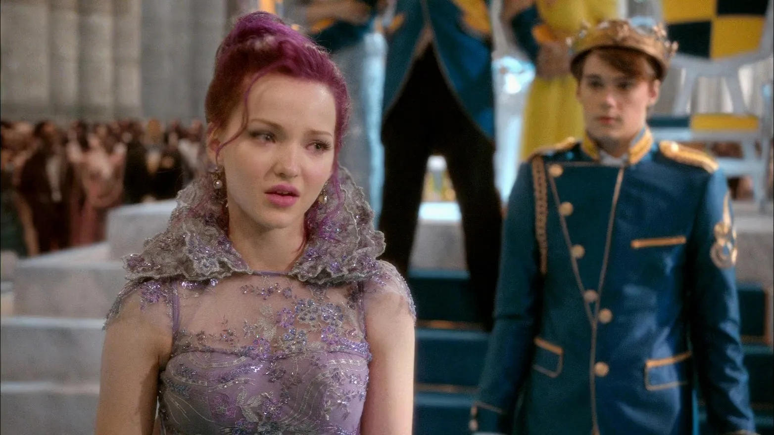 Cast: Dove Cameron as Mal, Cameron Boyce as Carlos, Booboo Stewart as Jay, Sofia Carson as Evie, Mitchell Hope as Ben, Melanie Paxson as Fairy Godmother, Brenna D'Amico as Jane, Sarah Jeffery as Audrey, Zachary Gibson as Doug, Jedidiah Goodacre as Chad Charming, Dianne Doan as Lonnie, Dan Payne as Beast, Keegan Connor Tracy as Belle, Wendy Raquel Robinson as Cruella de Vil, Maz Jobrani as Jafar, Kathy Najimy as Evil Queen, Kristin Chenoweth as Maleficent, Shaughnessy Redden as Limo Driver, Reese Alexander as Coach Jenkins, James Hibbard as Museum Guard, Wesley Salter as Photographer, Judith Maxie as Queen Leah, Ken Lawson as Royal Tailor, Stephanie Bennett as Snow White, Jonathan Holmes as Mr. Deley, Peter Schaad as Tourney Announcer, Christian Lagasse as Footman #1, Paisley as Dude the Dog, Addy Chan as Dancer and Chorus Performer, Danny De Matos as Dancer and Chorus Performer, Devin Jameson as Dancer and Chorus Performer, J.P. Dubé as Dancer and Chorus Performer, Shane Simpson as Dancer and Chorus Performer, Tyler Layton-Olson as Dancer and Chorus Performer, Tony Giroux as Dancer and Chorus Performer, Aglaë Kounkou as Dancer and Chorus Performer, Jeff Mortensen as Dancer and Chorus Performer, Kayla Wallace as Dancer and Chorus Performer, Kiara Gudgeon as Dancer and Chorus Performer, Louise Hradsky as Dancer and Chorus Performer, Megan Serena Trainer as Dancer and Chorus Performer, Mark Samuels as Dancer and Chorus Performer, Jennifer Oleksiuk as Dancer and Chorus Performer, Kelly Konno as Dancer and Chorus Performer, Tatiana Parker as Dancer and Chorus Performer, Taylor James as Dancer and Chorus Performer, Michael Riccio as Dancer and Chorus Performer, Navid Charkhi as Dancer and Chorus Performer, Dwayne Gulston as Dancer and Chorus Performer, Marlyse Joe as Dancer and Chorus Performer, Jesse Devlin as Dancer and Chorus Performer, Morgan Tanner as Dancer and Chorus Performer, Brittany Gumundson as Dancer and Chorus Performer, Michelle Dawley as Dancer and Chorus Performer, Diedre Barnes as Dancer and Chorus Performer, Winnie Chang as Dancer and Chorus Performer, Desirée Manning as Dancer and Chorus Performer, Kyal Legend as Dancer and Chorus Performer, Audessa Parafina as Dancer and Chorus Performer, Ralph Escamillan as Dancer and Chorus Performer, Mike Ward as Dancer and Chorus Performer, Mackenzie Green as Dancer and Chorus Performer, Benjamin Ritter as Dancer and Chorus Performer, Castle Rock as Dancer and Chorus Performer, Ben Stillwell as Happy Student (uncredited)